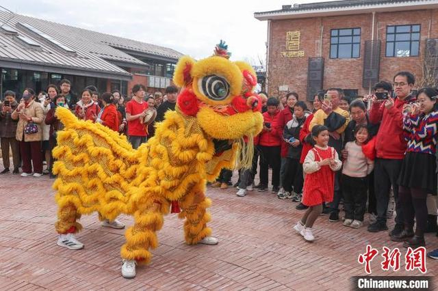 1月29日,大年初一,一场民俗巡游在江西赣州章贡区的老浮桥人文艺术村落举行,大型游龙、南狮、章贡高跷、民间鱼灯轮番上阵闹新春,众多游人驻足观看。图为南狮表演吸引民众观看。中新社记者 刘力鑫 摄