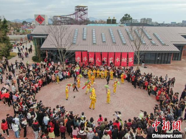 1月29日,大年初一,一场民俗巡游在江西赣州章贡区的老浮桥人文艺术村落举行,大型游龙、南狮、章贡高跷、民间鱼灯轮番上阵闹新春,众多游人驻足观看。图为章贡高跷表演吸引民众观看。(无人机照片)中新社记者 刘力鑫 摄