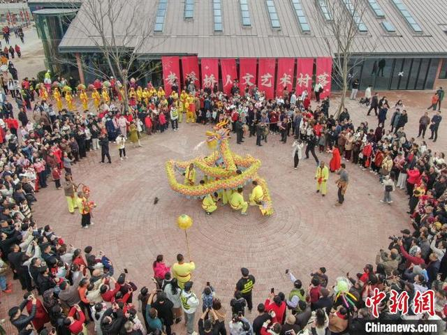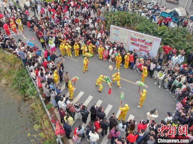 1月29日,大年初一,一场民俗巡游在江西赣州章贡区的老浮桥人文艺术村落举行,大型游龙、南狮、章贡高跷、民间鱼灯轮番上阵闹新春,众多游人驻足观看。图为民间鱼灯表演吸引民众观看。(无人机照片)中新社记者 刘力鑫 摄