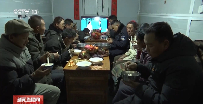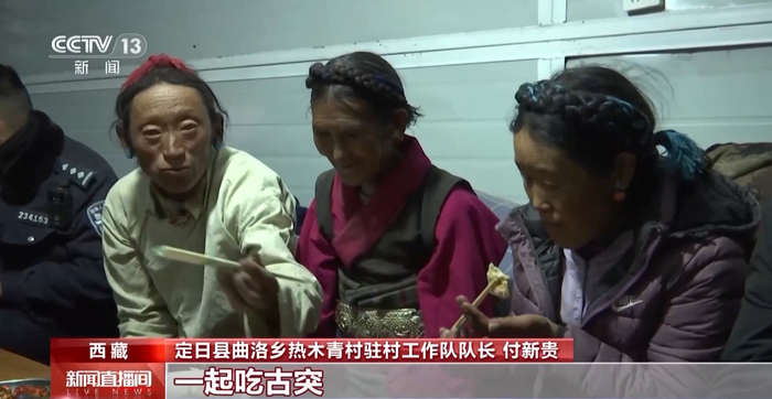 定日县曲洛乡热木青村驻村工作队队长 付新贵:今年因为发生了地震不能回家过年了,我们驻村工作队和村民聚在一起,一起吃古突,一起吃饺子,一起看春晚,一起聊天,这个除夕感觉很温暖。