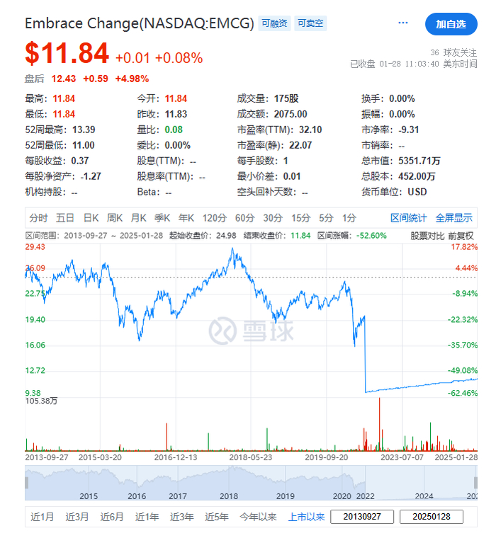 截至周一(2025年1月28日)收市,Embrace Change Acquisition Corp.(EMCG)每股报11.84美元,目前市值约5,351.71万美元。