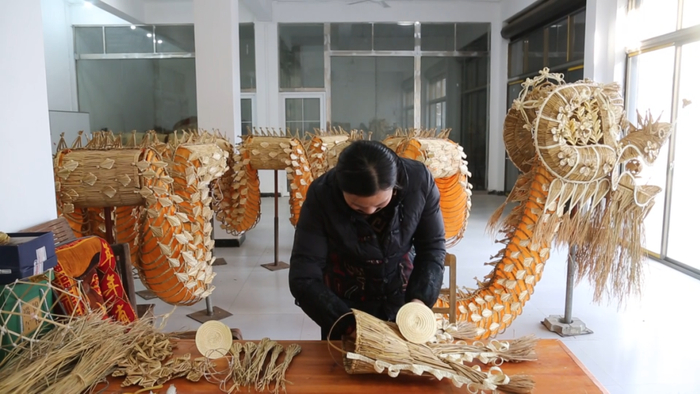 九江市湖口县非物质文化遗产保护中心主任 童艳华:草龙的制作要有耐心、有工艺,一般一条13节的草龙,要经历6个月的时间,要编8万多根稻草。
