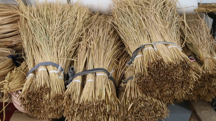 省级非物质文化遗产湖口草龙代表性传承人 喻远莉:你看我们这个草,不是所有的稻谷草都可以。用草也很有讲究的,我用的这个是糯谷草,糯谷草第一个它的亮度光泽度比别的草要白一点,好看一点,还有一个它的长短粗细比较均匀,最主要一点就是它的韧性度比较好。