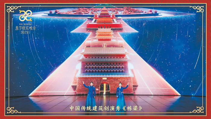 春晚开场视觉秀《迎福》在打铁花、剪纸等非遗中呈现天南地北的年味民俗,为观众送上五福临门的祝愿。中国传统建筑创演秀《栋梁》通过美轮美奂的视觉特效,将2024年申遗成功的“北京中轴线”在春晚舞台上徐徐展开。榫卯、斗拱等中式建筑的代表性元素跃然眼前,凤凰传奇唱出“走中线,挺直脊梁,昂起头,耸立九天”,抒发了“你我皆是栋梁”的壮志豪情。