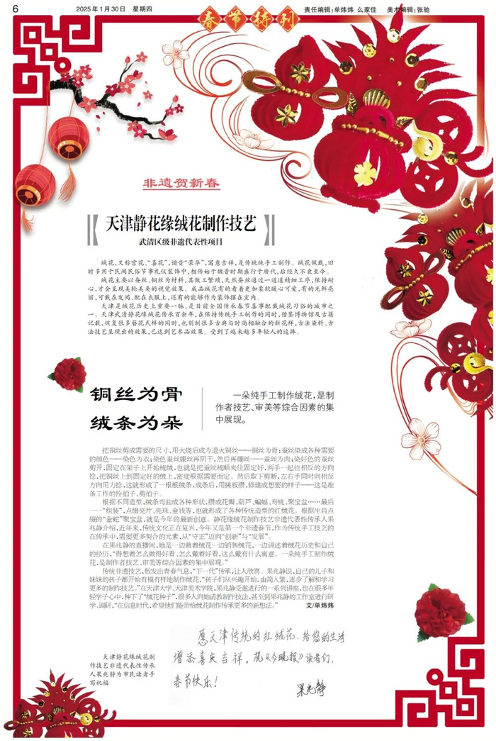 果兆静说,自己的儿子和妹妹的孩子都开始有模有样地制作绒花,“孩子们从兴趣开始,由简入繁,逐步了解和学习更多的制作技艺。”在天津大学、天津美术学院,果兆静受邀进行的一系列讲座,也在很多年轻学子心中,种下了“绒花种子”,很多人向她请教制作技法,甚至到果兆静的工作室进行研学、调研,“在信息时代,希望他们能带给绒花制作传承更多的新想法”。