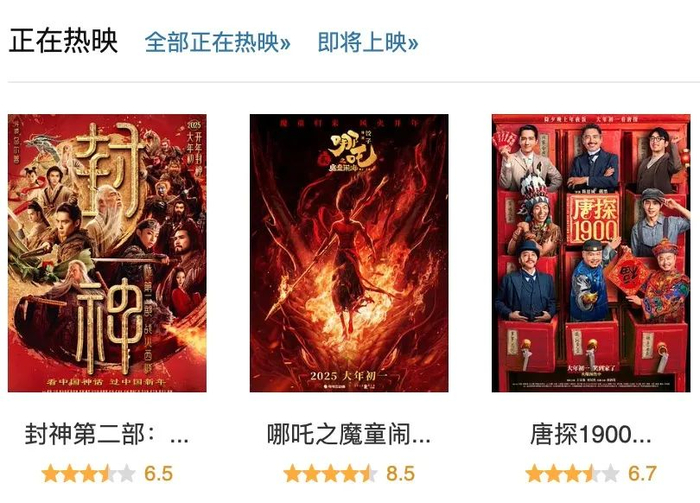 目前市场对《哪吒2》预期乐观。1月30日最新排片显示,《哪吒2》当日场次占比达25.7%,居各片之首,且影院经理透露后续将根据上座率动态上调。随着春节档后半段亲子观影需求持续释放,也将进一步推高票房。