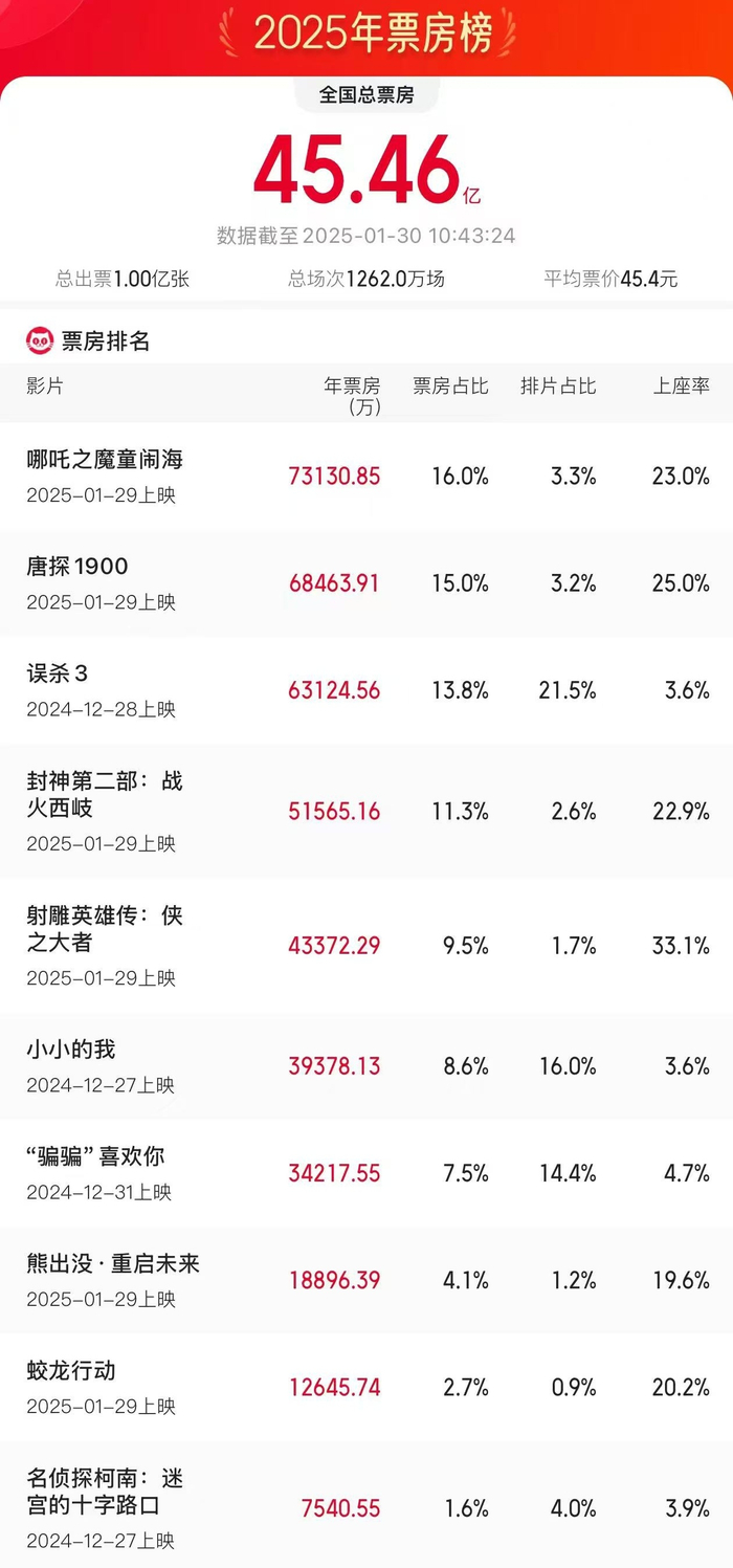 据网络平台数据,2025年1月30日10时43分,2025年度总观影人次破亿!总票房45.46亿,总场次1262万场,平均票价45.4元。