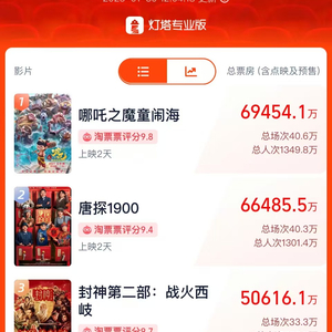 由原班人马耗时五年打造的《哪吒之魔童闹海》不负众望,大多数观众认为该片成色不俗,剧作扎实,反转惊喜,制作层面展现出中国动画工业最高水平。目前该片已创造多项纪录,不仅打破了由《熊出没·逆转时空》保持的春节档动画片单日票房纪录,且刷新了《姜子牙》保持的中国影史动画片单日票房纪录,猫眼专业版预测其内地总票房为49.49亿,与该系列第一部《哪吒之魔童降世》获得的50.35亿战绩较为接近。按照目前该片强劲走势和高口碑来看,有望对第一部战绩发起冲击,创造新的历史。