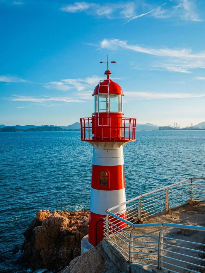 红白相间的配色在一片深蓝大海的映衬下尤为显眼蓝天、白云、海浪、灯塔随手一拍都是无限风景