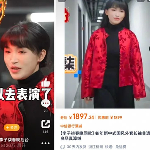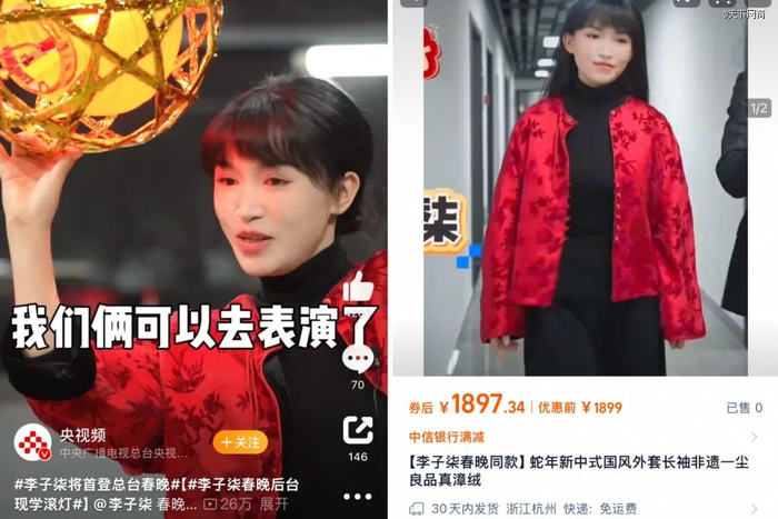 实际上,在春晚正式开演的前几小时,李子柒在央视采访中的一款暗红色的新中式外套就已经火了。新中式服饰商家“一尘良品”在李子柒登台后便在淘宝迅速上架了同款漳绒外套,称:“李子柒首次上春晚,讲述漳绒非遗故事,同款外套淘宝首发。”