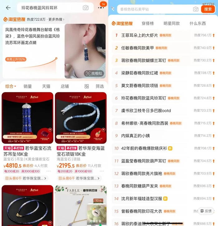 当晚,凤凰传奇玲花在春晚舞台献唱《栋梁》,蓝色的中国风装扮因为一枚耳畔的蓝风铃流苏耳环而更吸睛,很快,“玲花春晚蓝风铃耳环”登上淘宝热搜,热度达722万,本周搜索上升132%,数据显示,这款售价4800元的耳环在若华珠宝旗舰店已售出4件。