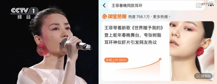 当然,晚会的带货顶流还得是王菲,在搭配这件事上,不少网友戏称,王菲“营业即王炸”。时隔七年,再登春晚舞台,*个火出圈的竟是神似虾片的树脂耳环,数据显示,该品一周内搜索上升180%,淘宝热搜热度达到756万,不少商家快速跟进同款,一位商家在宝贝标题写道:“耳饰预售,3月初发。”不仅耳环,王菲表演时的发际线腮红妆也一度引起广泛讨论。