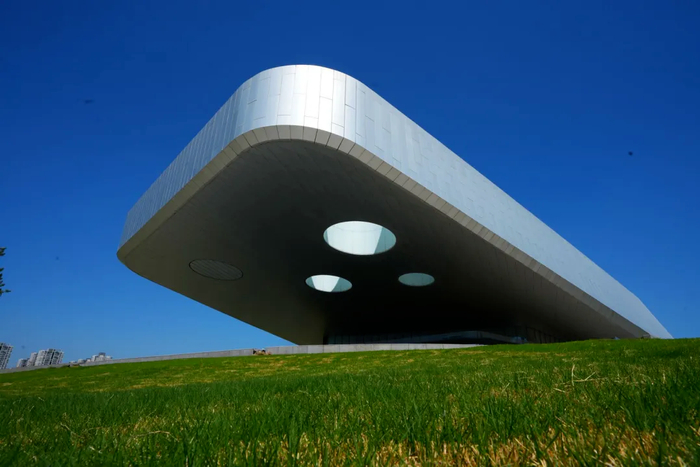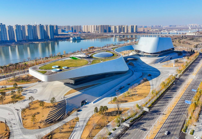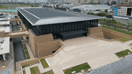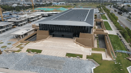 从空中俯瞰西安灞河西岸,一片连续而完整的翘曲屋面,犹如一本翻开的书,轻柔地铺展在灞河之侧,这就是坐落于西安浐灞国际港的长安书院。