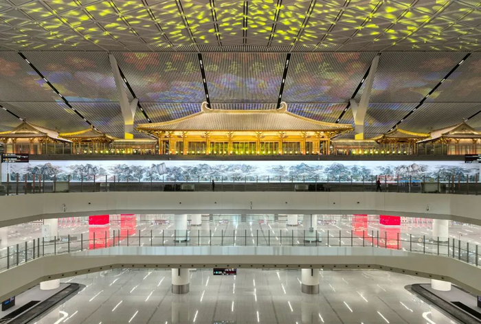 据悉,新建T5航站楼采用双层出发、双层到达的功能流程组织,实现国内、国际始发旅客同层出发,无需楼层转换,大大提升旅客舒适度。旅客从航站楼中心到最远端登机口步行距离不超过600米,步行时间仅需不到8分钟,旅客换乘中心也与航站楼无缝衔接,两层连通,换乘便捷。