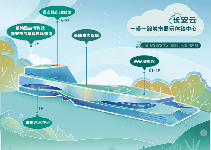 “长安云”围绕科技探索、美学熏陶、自然观察、城市探究、国际交流与互鉴五大功能定位,以科技馆、规划馆为核心布局,集自然馆、气象馆、陶瓷(艺)馆、综合配套服务区、城市艺术中心等“五馆一区一中心”为一体,是与西安生动而鲜活的城市发展、人民生活同频共振的知识中心、体验中心、交流中心。