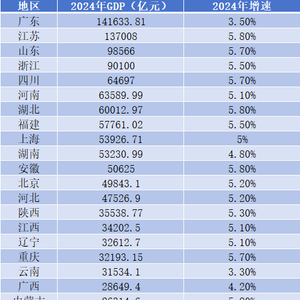 最受瞩目的十强省份排名依次为广东、江苏、山东、浙江、四川、河南、湖北、福建、上海和湖南,2024年GDP分别为141633.81亿、137008亿、98566亿、9.01万亿、64697亿、63589.99亿、60012.97亿、57761.02亿、53926.71亿和53230.99亿元。