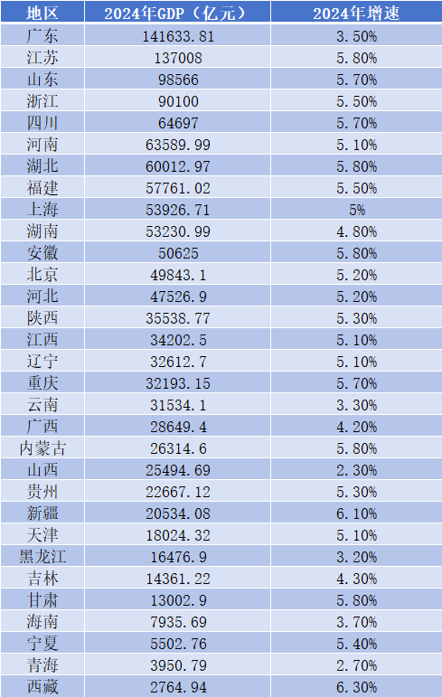 随着山西省在春节前发布了2024年经济数据,至此,全国31个省份2024年经济数据均已发布,广东、江苏和山东仍然稳居GDP总量前三位,而西藏、新疆,江苏、湖北、安徽、内蒙古和甘肃位居增速榜前三位。