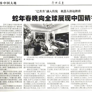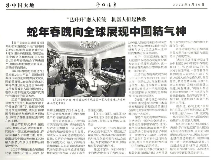 1月30日出版的《参考消息》刊发多家媒体报道,认为总台蛇年春晚向全球展现中国精气神。全文如下: