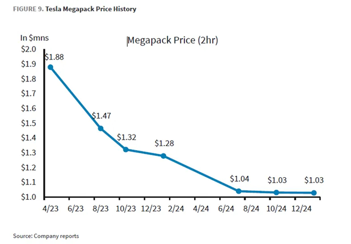 今年四季度实现营业收入30.6亿美元,略高于市场预期30.2亿美元,而本季度储能出货量继续高增,达到11GWH, 环比增长了近60%。而随着上海储能超级工厂在2025年一季度开始量产,特斯拉预计储能部署量将在2025实现50%的同比增长(2025年超过60Gwh)。