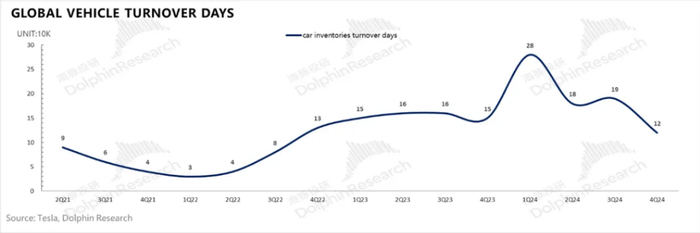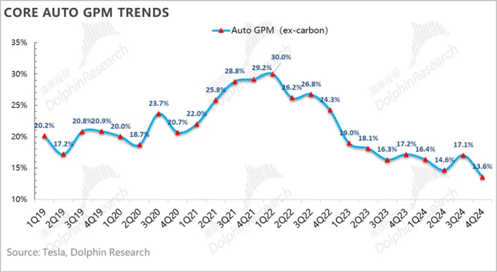 四季度汽车销售毛利率(剔碳积分和租赁)仅13.6%,环比下滑了近3.5个百分点!甚至都低于2Q24汽车业务毛利率的谷底时刻,大幅低于BBG一致预期16.2%和海豚君看到了买方预期15%!