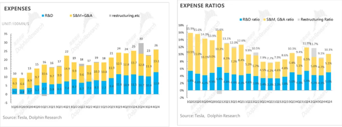 特斯拉本季度研发开支和销售费用又在继续加大,研发费用12.8亿,高于市场预期11.1亿,预计由于AI智能化投入以及新车系研发投入加大,而销售与行政费用本季度13.1亿,仍略高于市场预期12.9亿。