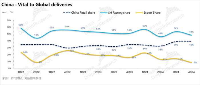 1)单车折旧效应:四季度销量环比回升7%,但单车折旧绝对值上反而环比略有上行100美元,海豚君认为可能主要由于上海工厂本季度的贡献占比下滑,由于上海工厂生产车型中对外出口的比例下滑(主要对欧洲),而鉴于上海工厂有着相比欧洲和美国工厂更强的制造成本优势,所以规模效应带来的单车摊折成本的下降本季度并没有体现。