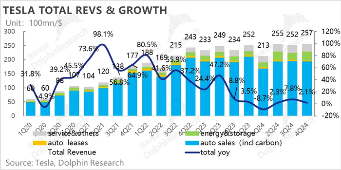 2024年四季度特斯拉营收257亿美元,大幅低于BBG卖方一致预期274亿,出现了约17亿的预期差,而问题的关键出在了最关键的卖车收入上。