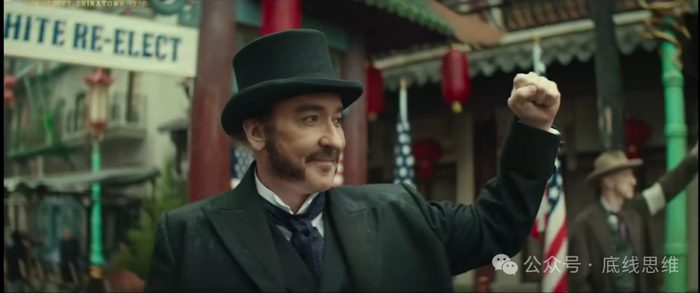 伴随着案件的侦破,电影同样直白地告诉了观众臭名昭著的《排华法案》背后真正的原因——权力与金钱——政客为了选举操纵民众对于失业的恐慌,无依无靠的华人因为“勤劳”“能卷”成为了天选背锅侠。