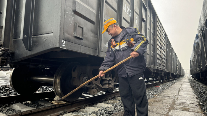 春节期间,记者走进蚌埠东站看到,一眼望不到头的车站,到发场和调车场里平行排列着32条股道,一列列机车如同钢铁巨兽般来回穿梭,铁路工作人员紧张有序地忙碌着。49岁的防溜连结员郑冲看了看手中的调车计划,便戴起手套,拿起铁鞋叉子向调车场走去。