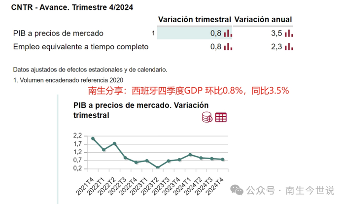 源自西班牙国家统计局公开的消息,2024年第四季度的经济实现了“环比上涨0.8%,同比大涨3.5%”的优异成绩,再一次在欧洲诸国中领跑。