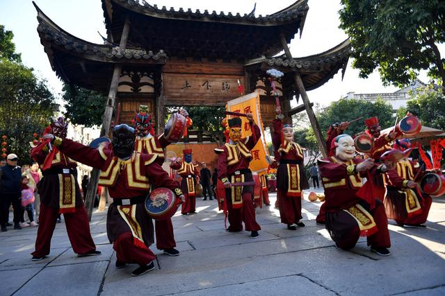 2022年1月18日,民俗表演艺人正在黄山市黟县宏村表演非遗民俗《傩舞》。