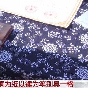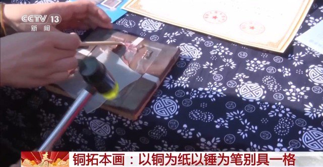 总台记者 刘军:在安徽省陵市义安区的犁桥水镇,在春节期间设置了非遗市集,让大家近距离感受传统技艺的魅力。我们现在看到的是铜拓本画,师傅将铜板覆盖在事先制作好的木模版上,然后通过小锤反复敲打,把图案拓印到铜板上,一幅精美的铜拓本画就呈现在眼前。铜陵因铜得名,铜文化源远流长,铜拓本画就是以铜为纸、以锤为笔,将人们的构思在铜板上呈现,形成独具一格的作品。