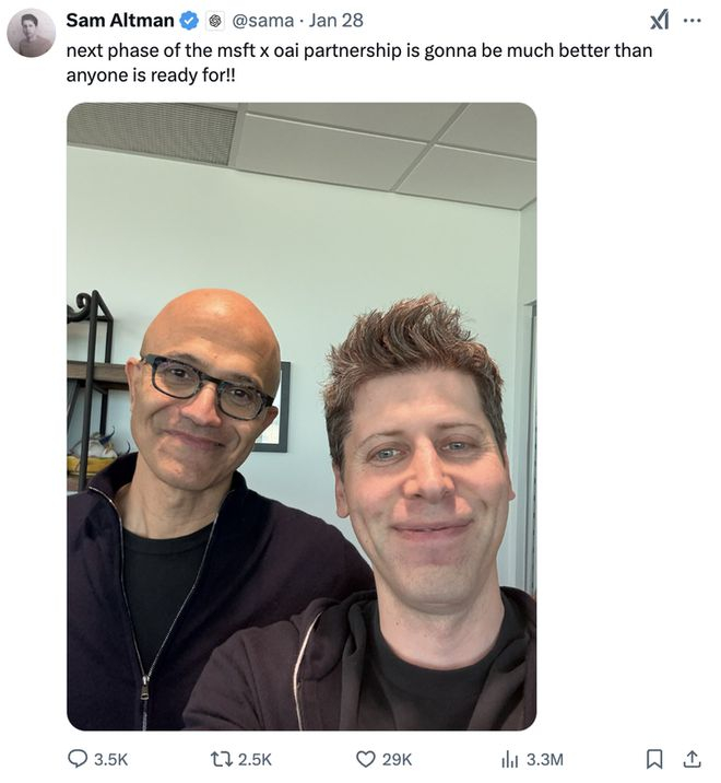 SamAltman发推称,OpenAI与微软下一阶段合作将比所有人预期地都好。