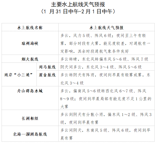 1月31日中午至2月1日中午,琼州海峡多云,早晚时段有轻雾或雾,风力5级、阵风6级,有雾时琼州海峡航段能见度差,对通航有一定影响,其余时段通航气象条件良好。