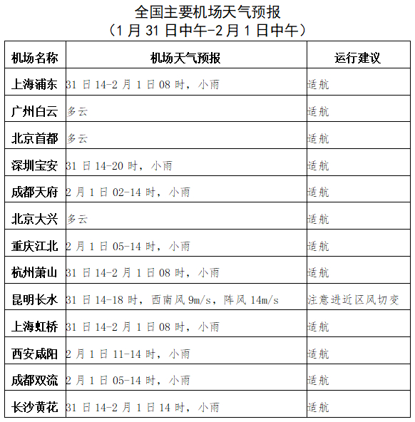 31日中午至2月1日中午,乌鲁木齐、郑州等机场有小雪;2月1日凌晨至早间,雷州半岛、海南东部地区受低云和海雾影响,海口机场有800米的大雾。