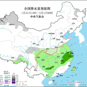 图1 全国降水量预报图(1月31日14时-2月1日08时)