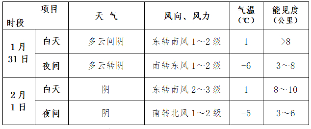 未来两天,北京地区天气以阴为主;近地面湿度增大,能见度有所下降,夜间最低能见度3~6公里;白天最高气温1℃左右,夜间最低气温-6~-5℃。具体预报见附表: