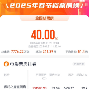 网络平台数据显示,截至1月31日11时55分,2025春节档总票房(含预售)破40亿元。