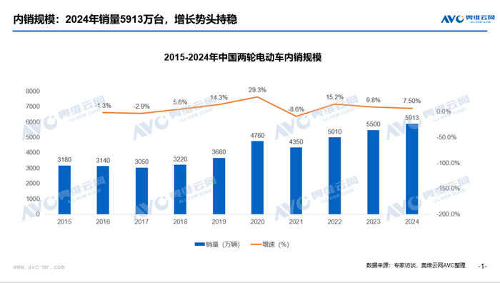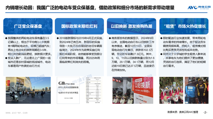 奥维云网调研数据显示,2024年我国两轮电动车国内销量约5900万辆,同比增长7.5%,但整体增速放缓,市场趋向平稳,我们将2024年的规模增长归结为以下4个原因: