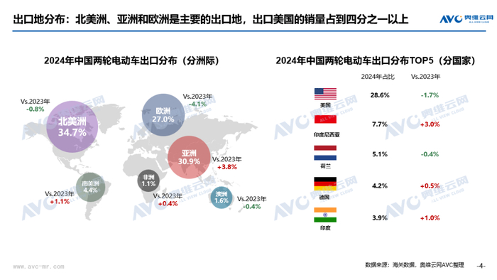 东南亚市场成为新的增量市场:我国两轮电动车的出口地主要集中在北美洲、亚洲及欧洲,分别占到34.7%、30.9%和27.0%。2024年,出口量TOP5的国家中,美国、荷兰的市场结构占比同比减少1.7和0.4%,印度尼西亚、印度和德国市场结构占比分别增长3%、1%和0.5%。出口地分布广泛,用户需求差异较大,不同出口地的产品功能卖点需要更有针对性:出口市场分布广泛,不同地域的用户需求也存在较大差异,如欧美市场偏爱中高档的电动摩托车和电助力自行车,除了代步,还兼具休闲玩乐属性;东南亚市场主打性价比,出口产品以中低端的轻便款车型为主;南美国家多丘陵山地,因此大功率电动摩托车更受青睐;非洲则将电动车作为运输工具,更看重其装载能力。