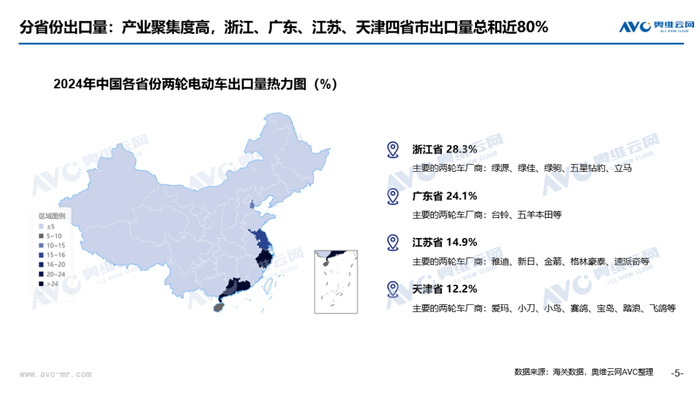 我国的电动车制造产业集中度高,从主要出口省份来看,2024年出口量前四的省份依次为浙江、广东、江苏、天津,出口量合计占比达到79.4%。