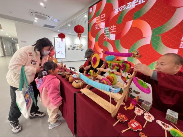 虹口区文化馆新时代文明实践特色站举办“2025乙巳蛇年虹口区迎春民俗风情展”,本次活动特意结合“国潮四季”非遗品牌,推出民俗展览、非遗技艺展示、直播互动、手工体验等系列活动。现场,一首来自于1987年间虹口区新港路街道的《十二花名生肖灯》让大家都不禁驻足停留。现场的非遗技艺展示区中,书法老师在现场挥毫,书写并送出一副副春联和福字,顿时让大家感受到了浓浓的过年仪式感。而在中国传统书法上加以创新的蛇年版福字更是引得小朋友们纷纷围观,感受着中国传统文化的传承与创新。