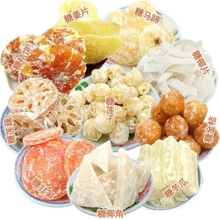 此外,各种广东专属各种甜腻的糖制品,在桌上堆成小山,让人吃到牙痛,直呼招架不住。