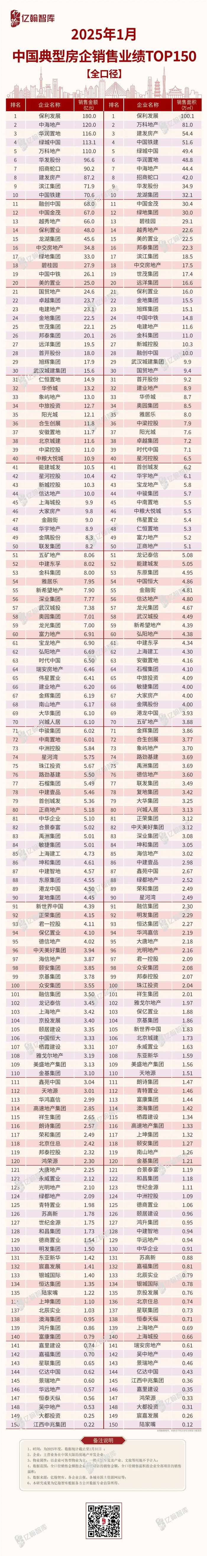 2025年1月中国典型房企销售业绩TOP150研究报告【第127期】