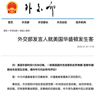 据外交部网站1月31日午间消息,外交部发言人就美国华盛顿发生客机和军机相撞事件答记者问,表示“中方对遇难者表示沉痛哀悼,对遇难者家属表示深切慰问。”