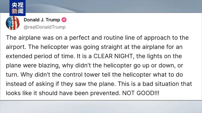对此,美国总统特朗普通过社交媒体发表声明称,“这起可怕的撞机事件本可被阻止”。