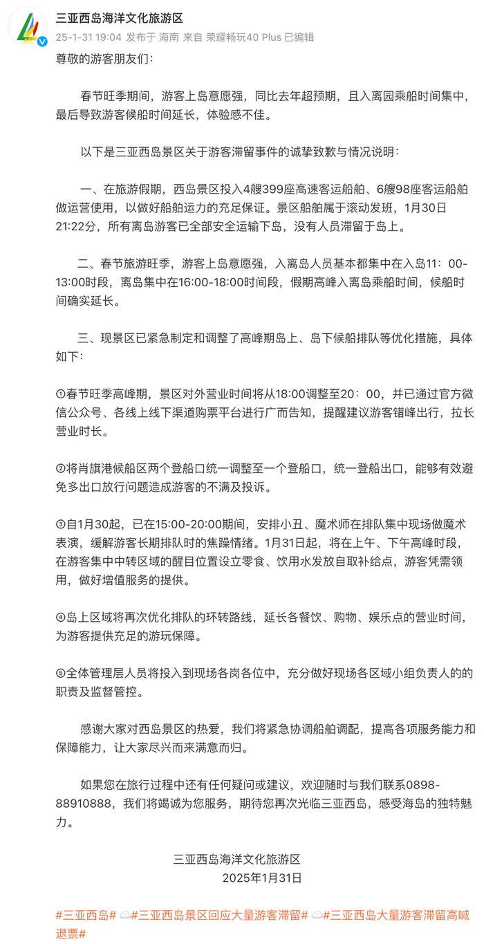 1月31日,三亚西岛景区就游客滞留事件致歉,并发布情况说明: