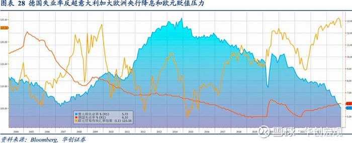 在欧元区企业面对的所有成本冲击中,能源价格上涨是长期且几乎无解的。高债务对于财政政策的约束使得这个成本冲击无法向家庭部门转嫁。欧洲央行追求纸面意义的通胀目标2%,促使欧元汇率过高,又让这个成本冲击缺少向外部需求转嫁的空间。达成2%通胀目标的实质变成以北欧尤其是德国企业产出承压,换取南欧家庭消费复苏,这已经明显的反映到劳动力市场。截止2024年11月份,意大利失业率降至5.7%,德国失业率升至6.1%。2022年下半年以来,意大利失业率从8.2%降至5.7%,降幅2.5%,德国失业率从5.3%升至6.1%,升幅0.8%,最重要的信号是,2024年9月份德国失业率反超意大利失业率。