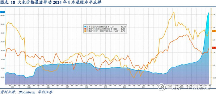 对于通胀来说,食品价格上涨是重中之重,导致食品价格居高不下的原因,主要是大米供需不平衡。2024年11月份日本大米价格同比上涨63.6%,连续23个月上涨,同比涨幅触及1975年9月份以来的最高水平,新米批发价格上涨57%,也触及2006年9月份以来最高水平。造成大米供需不平衡的原因,一是只有14.7%的日本稻米种植面积是耐高温品种,受到2023年夏季高温的影响,2024年大米供给不足,2023年秋季日本的主食用大米产量为661万吨,需求为705万吨;二是2024年8月份,南海海槽地震预警和台风季叠加,引发大米抢购潮。当月第1周和第2周的粳米和包装米购买数量比2023年同期高出40%-50%;三是日本农林水产省为了保护农民利益,拒绝向市场投放规模为100万吨的大米储备。农林水产省预计2024年大米产量比前一年增加22万吨,达到683万吨,或将明显缓解大米供需不平衡,倘若产量不及预期,还有大米储备可以投放市场,这意味着2025年食品价格支撑日本通胀的力度难以持续。
