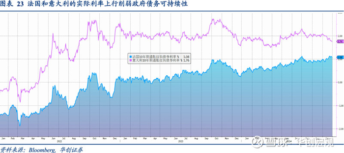 与此同时,欧元区通胀水平加速下行,欧洲央行降息速度缓慢,实际利率水平居高不下,这使得欧元区政府负债压力上升,债务可持续性下降。截止2024年三季度,法国10年期通胀挂钩债券利率升至1.1%,触及2012年6月份以来最高水平。意大利10年期通胀挂钩债券利率为1.8%,比2021年四季度高出230个基点。可以说美债利率上行压力是财政刺激高效的体现,欧元区成员国政府债券利率上行压力是财政刺激低效的体现。前者反应的是风险偏好上升,追逐更高回报资产的逻辑;后者反应的是债务可持续性下降,规避违约风险的逻辑。